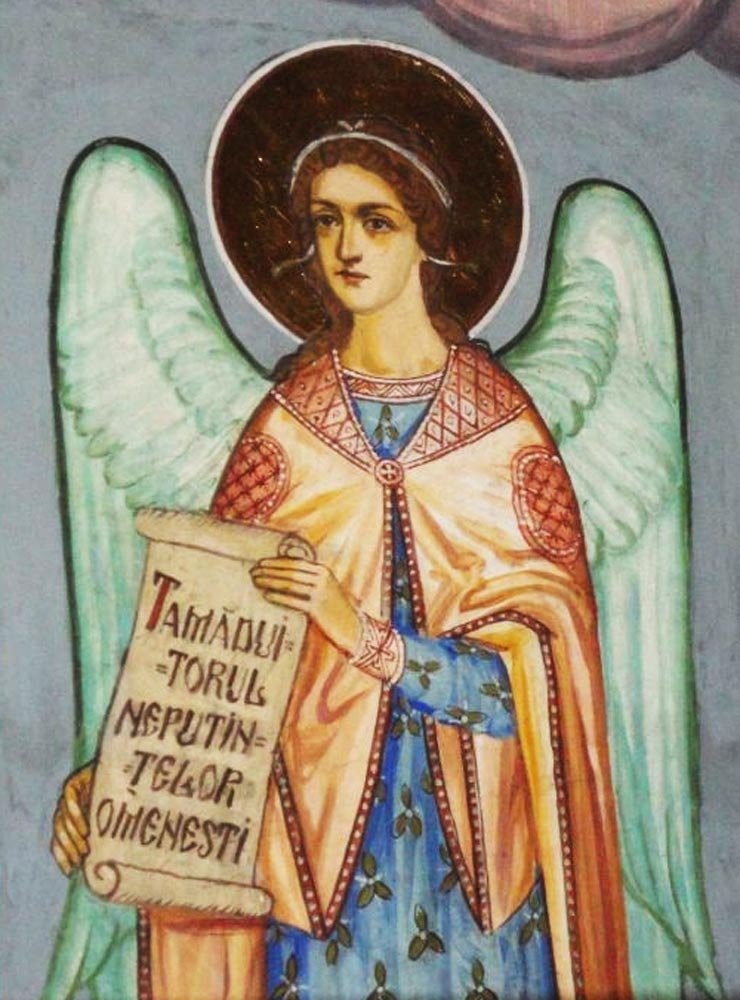 Îngerii din Cer au fost chemaţi la porunca Domnului Atotcuprinzător să se alăture vitejiei tale şi împreună cu Sfinţii Arhangheli Mihail şi Gavriil să învingeţi oastea cea răzvrătită şi pe al ei conducător, alungându-i în genunea întunecată pentru veşnicie. Iar noi, încercând să înţelegem cu sufletul ceea ce mintea nu poate pricepe, cutremuraţi, cu frică şi cu bucurie strigăm unele ca acestea: