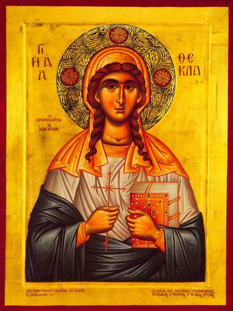 Pe tine ceea ce erai logodită cu Tamir, logodnicul Bisericii, Sfântul Pavel, te-a logodit cu Mirele Cel Ceresc, ca pe ceea ce ai fost fără prihană, Sfântă Tecla Preaînţeleaptă.Sfântă Mare Muceniţă Tecla, roagă-te lui Dumnezeu pentru noi.